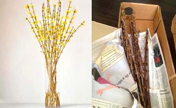 Kurumuş dalda uçan sarı çiçeklerden oluşan buket, alıcının elinde çiçekleri gitmiş şekilde duruyor.