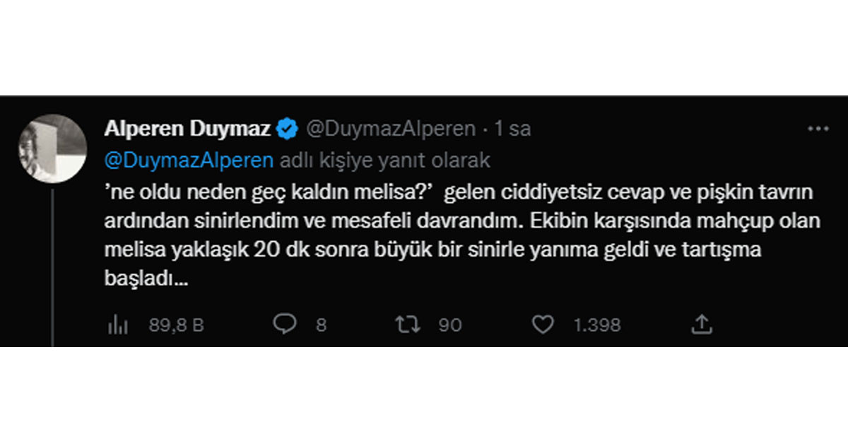 ’ne oldu neden geç kaldın melisa?’ gelen ciddiyetsiz cevap ve pişkin tavrın ardından sinirlendim ve mesafeli davrandım. Ekibin karşısında mahçup olan melisa yaklaşık 20 dk sonra büyük bir sinirle yanıma geldi ve tartışma başladı…