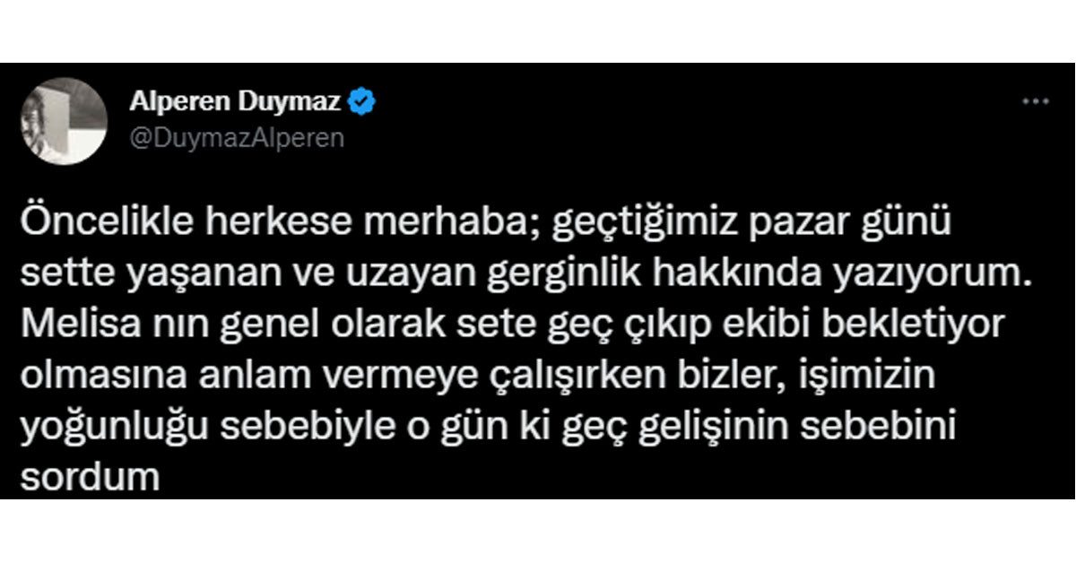 Ünlü oyuncu;” Öncelikle herkese merhaba; geçtiğimiz pazar günü sette yaşanan ve uzayan gerginlik hakkında yazıyorum. Melisa nın genel olarak sete geç çıkıp ekibi bekletiyor olmasına anlam vermeye çalışırken bizler, işimizin yoğunluğu sebebiyle o gün ki geç gelişinin sebebini sordum.