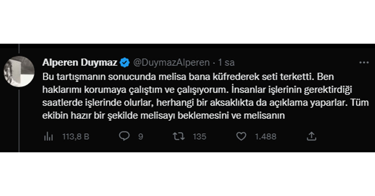 Bu tartışmanın sonucunda melisa bana küfrederek seti terketti. Ben haklarımı korumaya çalıştım ve çalışıyorum. İnsanlar işlerinin gerektirdiği saatlerde işlerinde olurlar, herhangi bir aksaklıkta da açıklama yaparlar. Tüm ekibin hazır bir şekilde melisayı beklemesini ve melisanı
