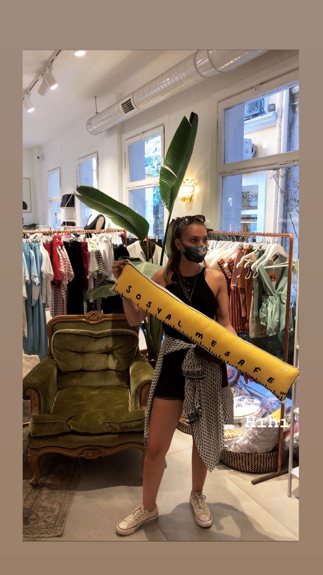 Aslı enver, alışveriş için gittiği bir mağazada üzerinde sosyal mesafe yazan bir yastıkla poz verdi. ünlü oyuncu, bu kareyi sosyal medya hesabında yayınlamayı da ihmal etmedi.