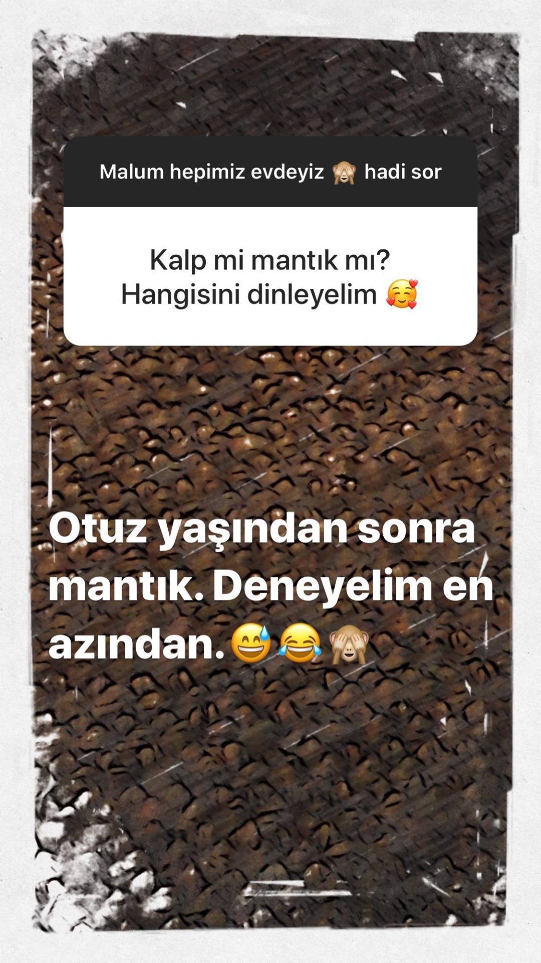 Ünlü oyuncu aslı enver, sosyal medya hesabında takipçilerinin sorularını yanıtladı. enver, ‘kalp mi mantık mı? hangisini dinleyelim?’ şeklindeki soruya verdiği cevapla dikkat çekti.