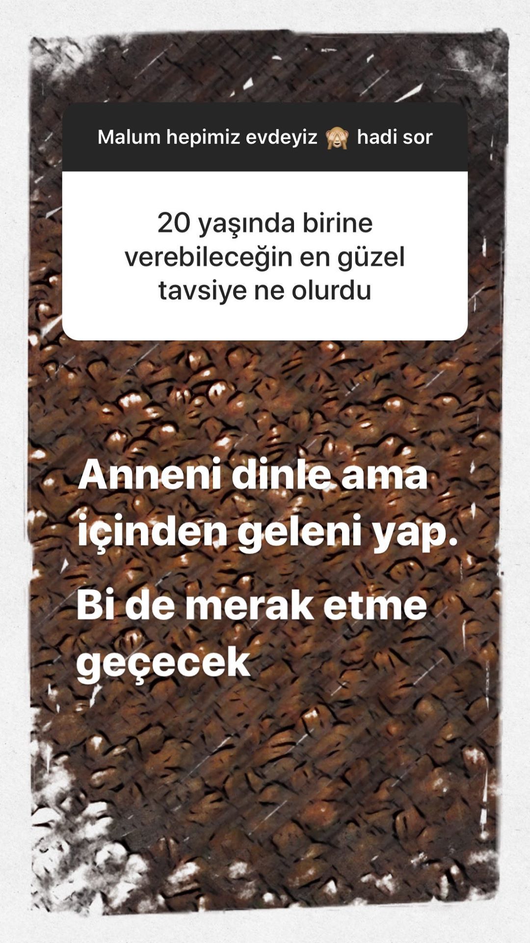 Güzel oyuncu, ’20 yaşında birine verebileceğiniz en güzel tavsiye ne olurdu’ sorusuna şöyle karşılık verdi: anneni dinle ama içinden geleni yap. bir de merak etme geçecek.