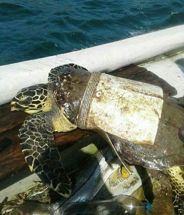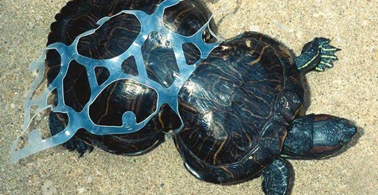 bu genç kaplumbağa bir plastik parçaya sıkışmış.