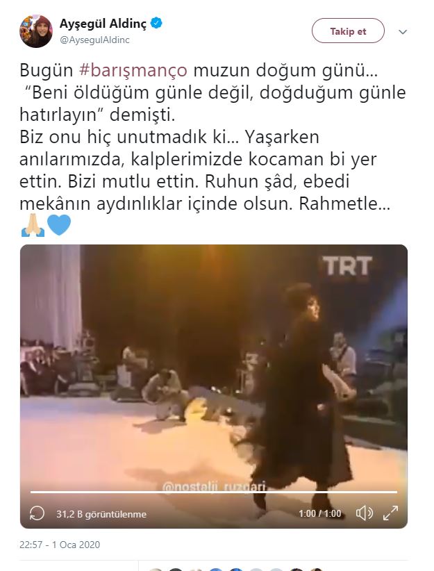 Ünlü şarkıcı ve oyuncu ayşegül aldinç, sosyal medya hesabında usta sanatçı barış manço’nun 77’inci yaş gününe özel bir paylaşımda bulundu.