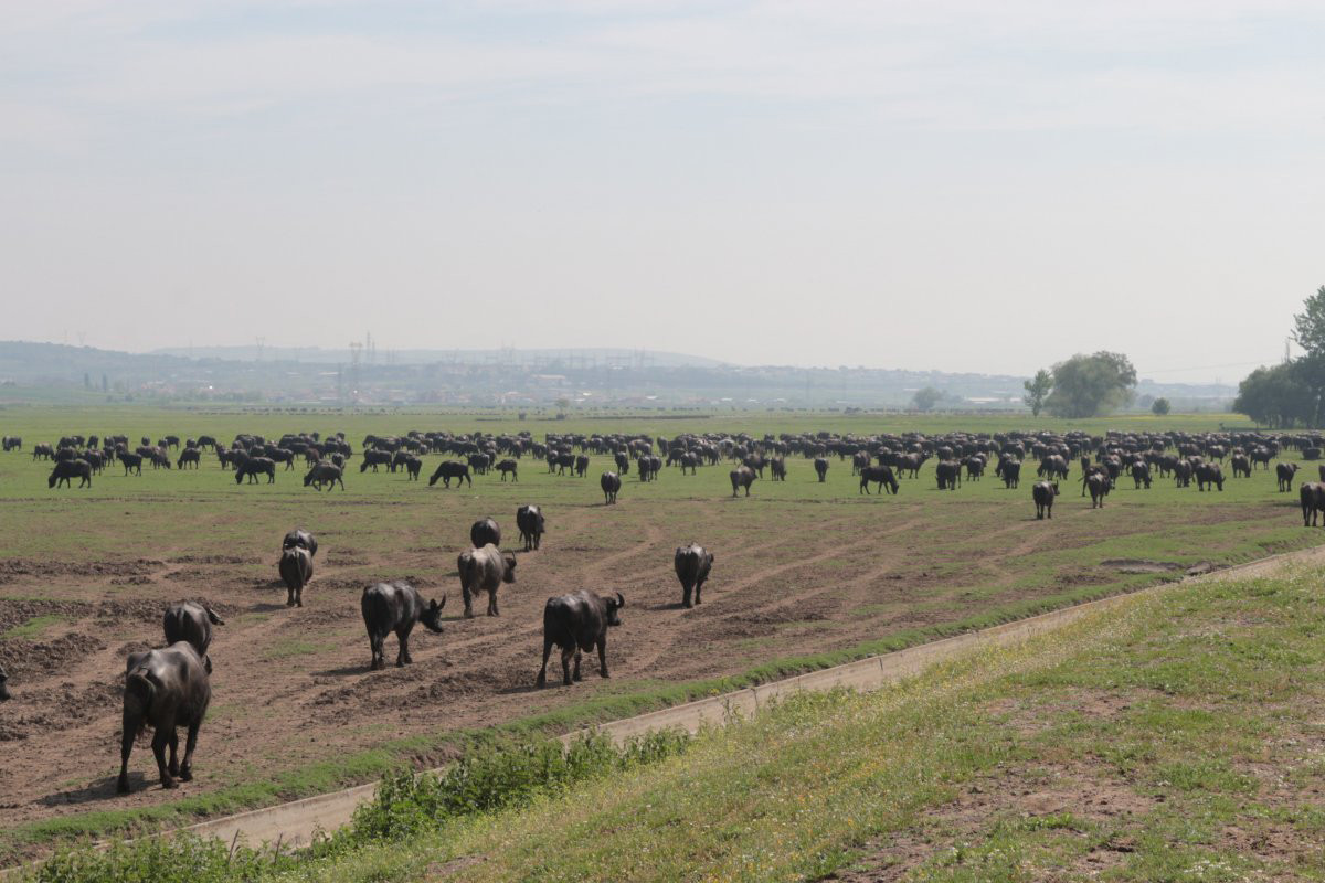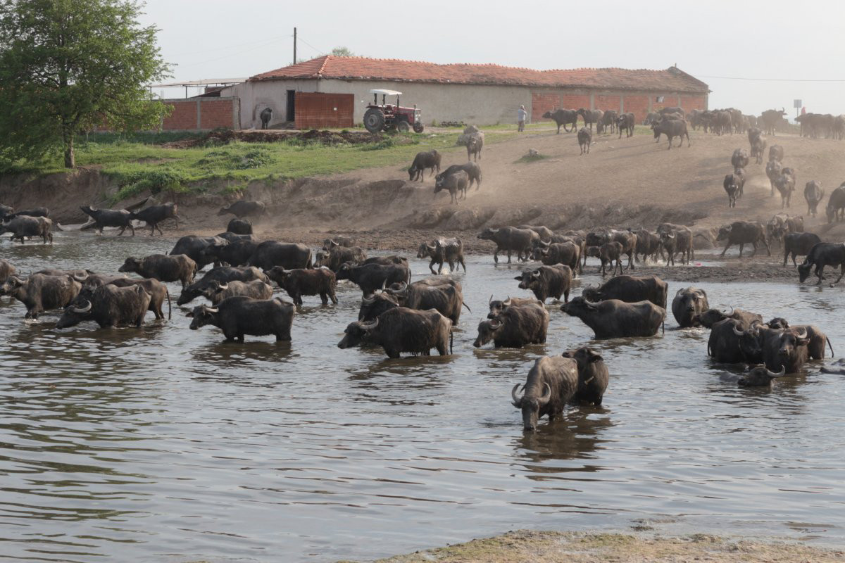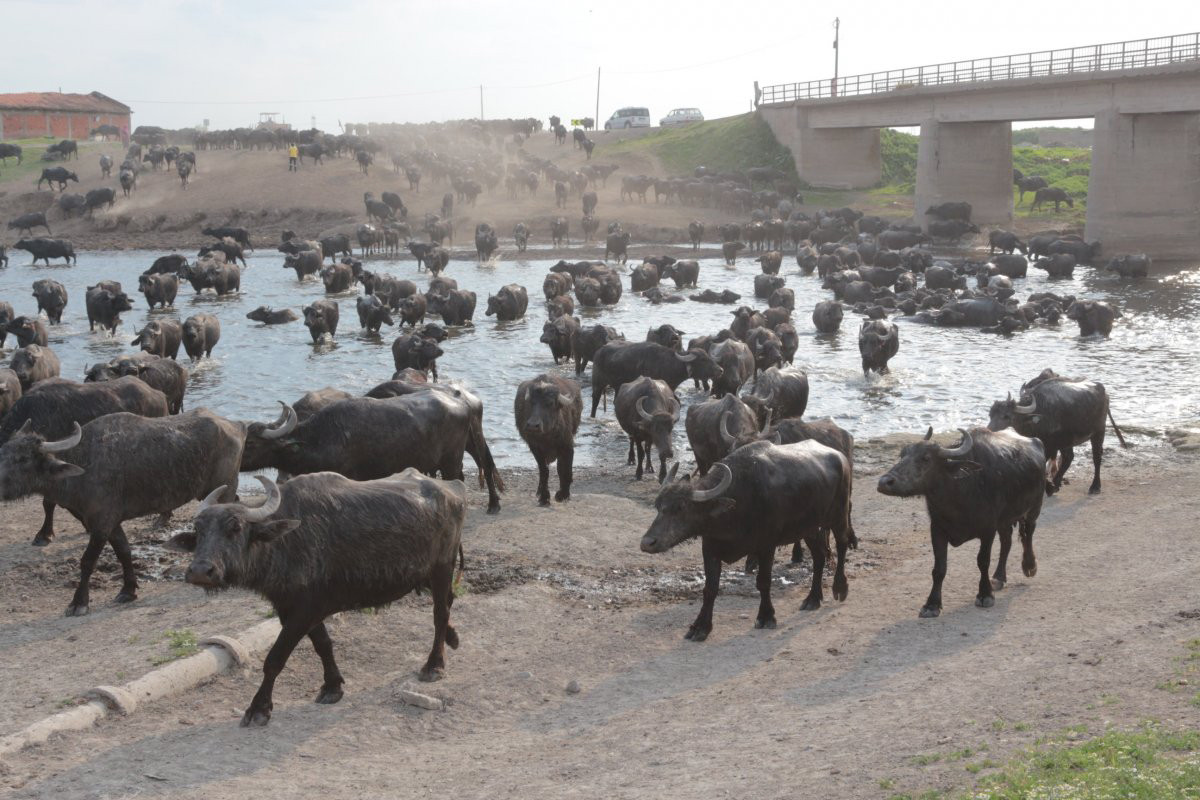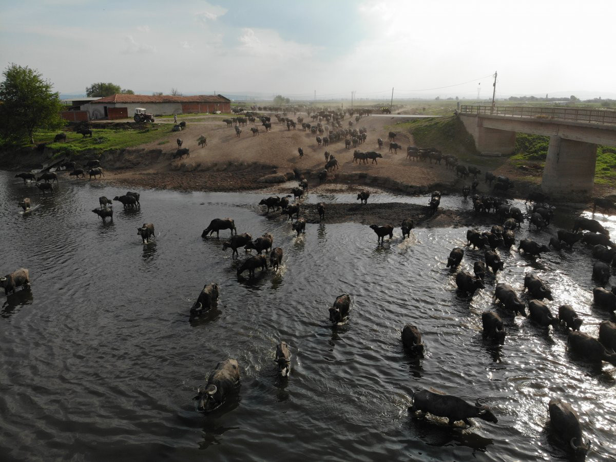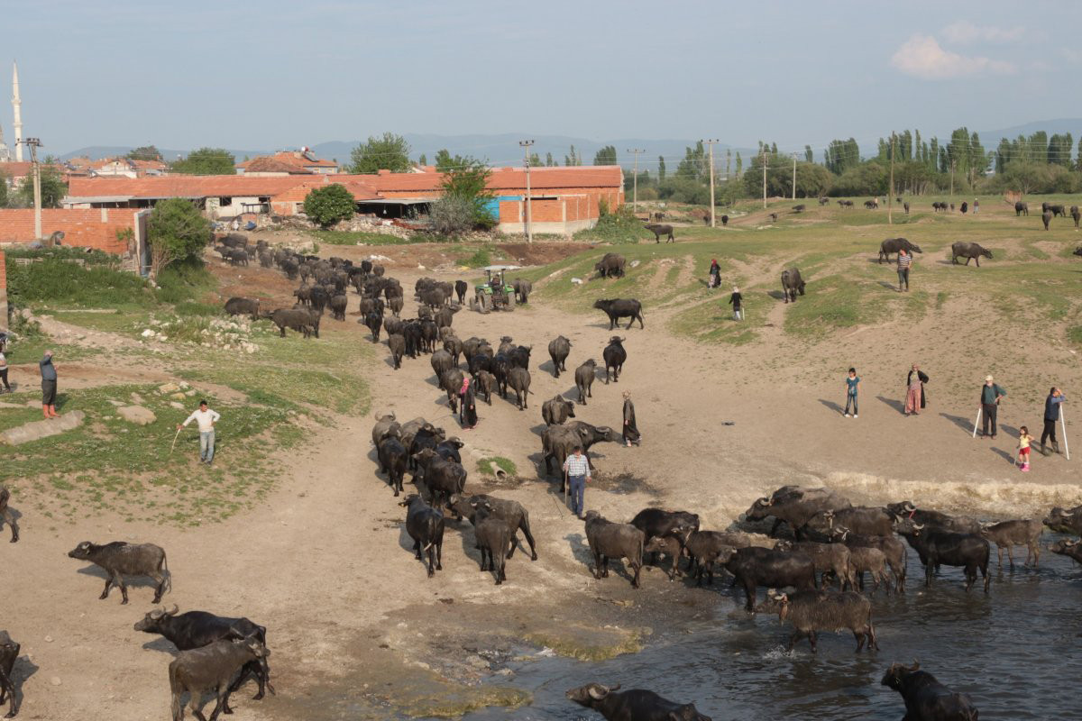 Balıklı kırsal mahallesinde mera ile mahalle arasında bulunan dereden geçerek ahırlarına dönen manda sürüsü, Afrika’daki öküz başlı antilopların büyük göçünü hatırlatıyor.