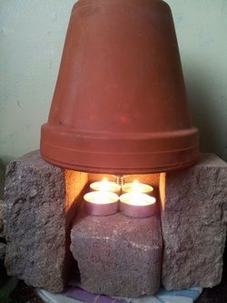 El yapımı bir ısıtıcı kullanarak tüm odayı ısıtabilirsiniz. pişmiş toprak bir tencereyi ters çevirin, mumların üzerine yerleştirin ve etrafına biraz tuğla koyun.