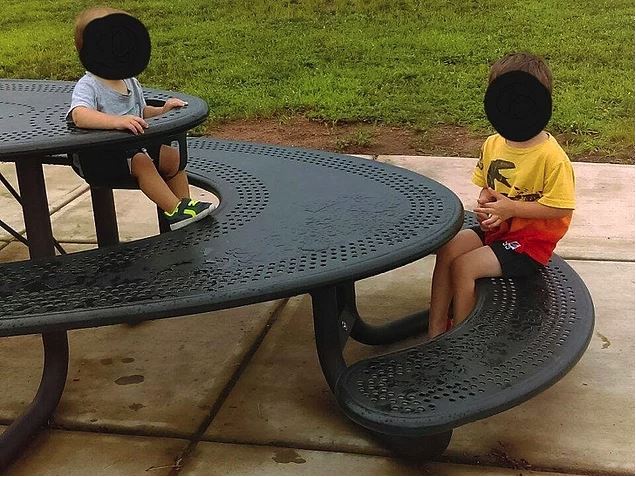 "bebekler için yerleşik bir koltuğa ve küçük çocuklar için de küçük bir tezgaha sahip piknik masası."