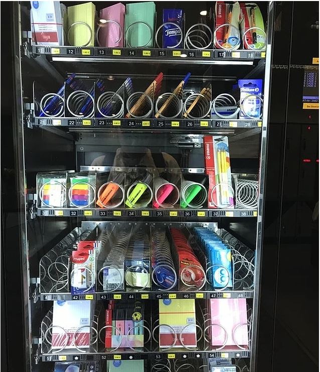 "bu otomat makinesiyle kütüphanede, kırtasiye malzemeleri satılıyor."