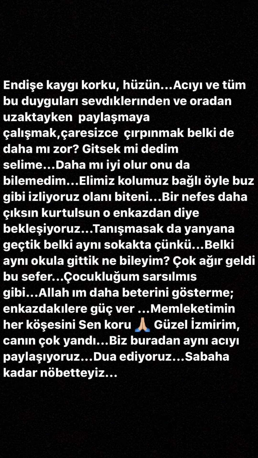 Belki aynı okula gittik ne bileyim… çok ağır geldi bu sefer… allah’ım daha beterini gösterme; enkazdakilere güç ver… memleketimin her köşesini sen koru. güzel izmir’im canın çok yandı… biz buradan aynı acıyı paylaşıyoruz… dua ediyoruz… sabaha kadar nöbetteyiz…’