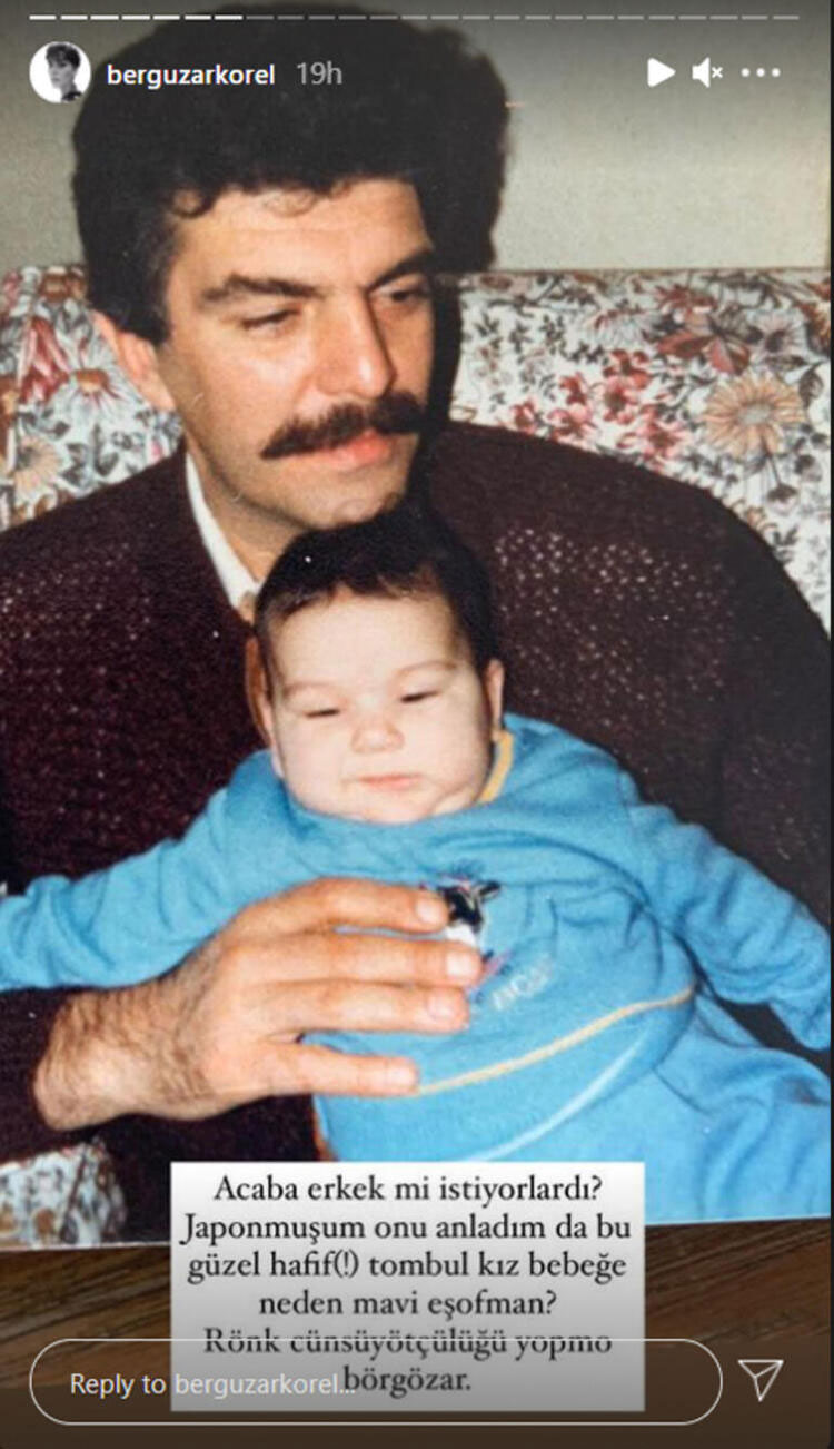 Babası Tanju Korel’in kucağında oturduğu bir fotoğrafa ise ‘Acaba erkek mi istiyorlardı? Japon'muşum onu anladım da bu güzel hafif (!) tombul kız bebeğe neden mavi eşofman? 'Rönk cönsöyötçülüğü yapma Börgözar.’ dedi.