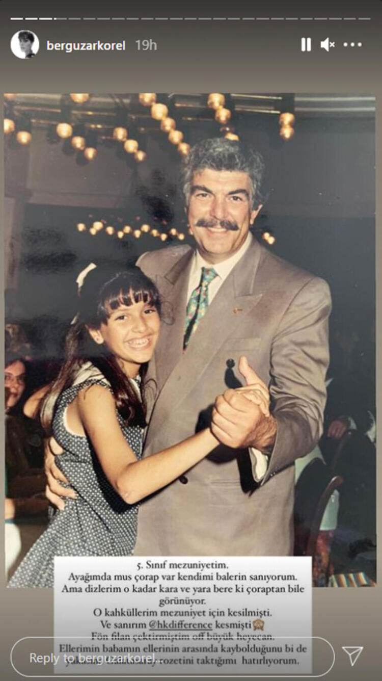 Babası Tanju Korel ile dans ederken çekilen bir fotoğrafı paylaşan Korel, bu fotoğrafa da ‘Beşinci sınıf mezuniyetim. Ayşağımda mus çorap var, kendimi balerin sanıyorum. Ama dizlerim o kadar kara ve yara bere ki çoraptan bile görünüyor. O kaküllerim, mezuniyetim için kesilmişti. Fön filan çektirmiştim. Offf büyük heyecan! Ellerimin, babamın ellerinin arasında kaybolduğunu bir de yakama Galatasaray rozetini taktığımı hatırlıyorum’