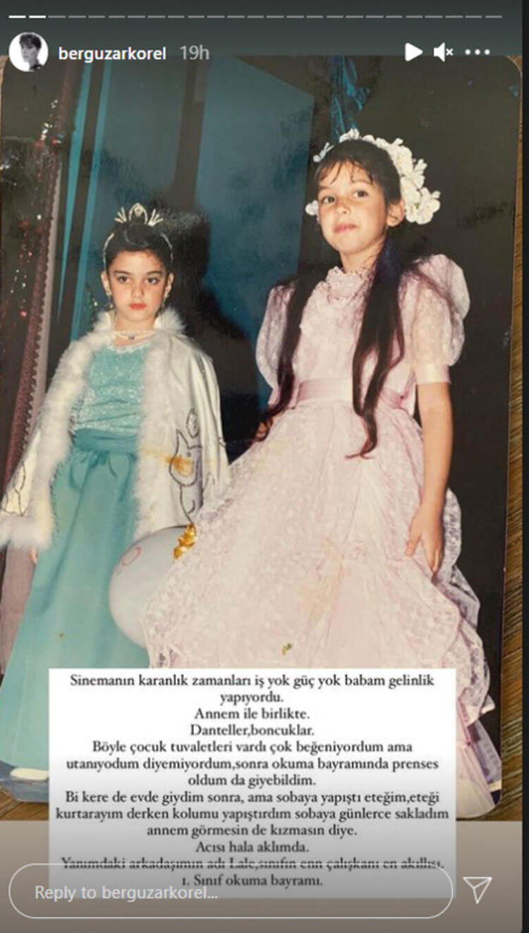 Paylaştığı bu fotoğrafa ise; ‘Sinemanın karanlık zamanları, iç yok güç yok. Babam gelinlik yapıyordu annem ile birlikte. Dantelle boncuklar... Böyle çocukluk tuvaletleri vardı, çok beğeniyordum ama utanıyordum, diyemiyordum. Sonra okuma bayramında prenses oldum da giyebildim. Bir kere de evde giydim sonra. Ama sobaya yapıştı eteğim, eteği kurtarayım derken kolumu yapıştırdım sobaya. Günlerce sakladım, annem görmesin, kızmasın diye. Acısı hala aklımda. Yanımdaki arkadaşımın adı Lale, sınıfın en çalışkanı, en akıllısı. Birinci sınıf okuma bayramı.’