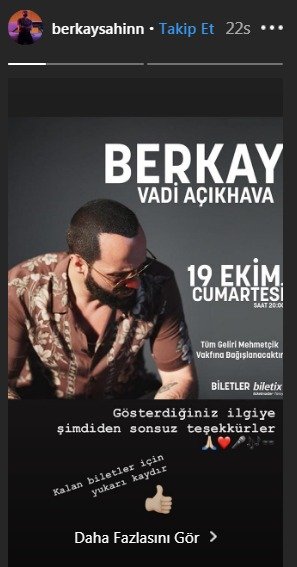 Öte yandan berkay şahin, ınstagram'ın hikaye kısmında yaptığı paylaşıma link bırakarak hayranlarını bilet almaya teşvik etti.