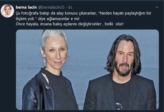 Oyuncu berna laçin, twitter hesabında geçtiğimiz gün sevgilisi ile verdiği pozla sosyal medyayı sallayan keanu reeves'le ilgili bir paylaşımda bulundu.