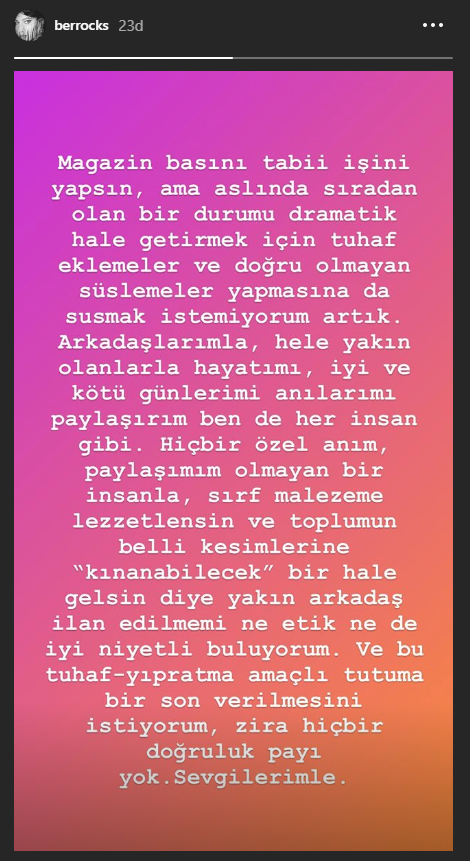 Instagram hesabında açıklama yapan güzel oyuncu berrak tüzünataç, şu ifadeleri kullandı: “magazin basını tabii işini yapsın ama aslında sıradan olan bir durumu dramatik hale getirmek için tuhaf eklemeler ve doğru olmayan süslemeler yapmasına da susmak istemiyorum artık.