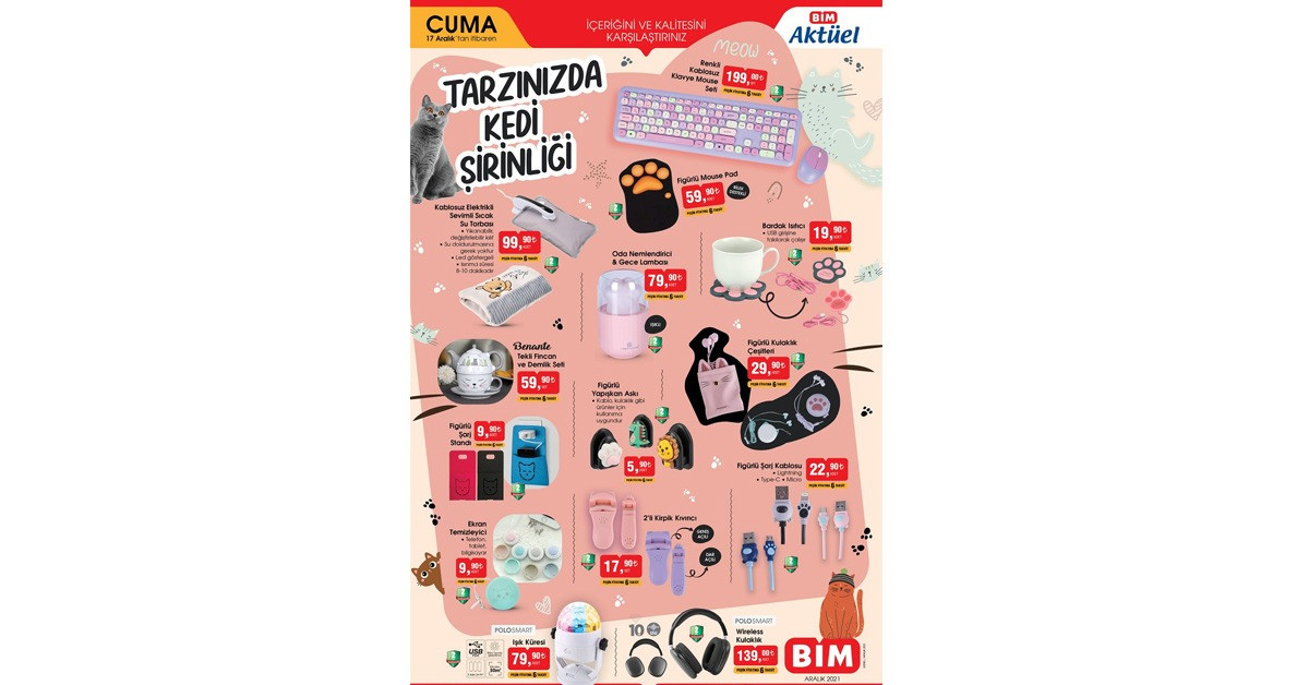 Bu hafta Bim'de kedi konsepti var. Kedi figürü baskılı birbirinden farklı ürünler bu hafta Bim'de olacak. Renkli Kablosuz Klavye Mouse 199 TL fiyatıyla bu hafta Bim'de.