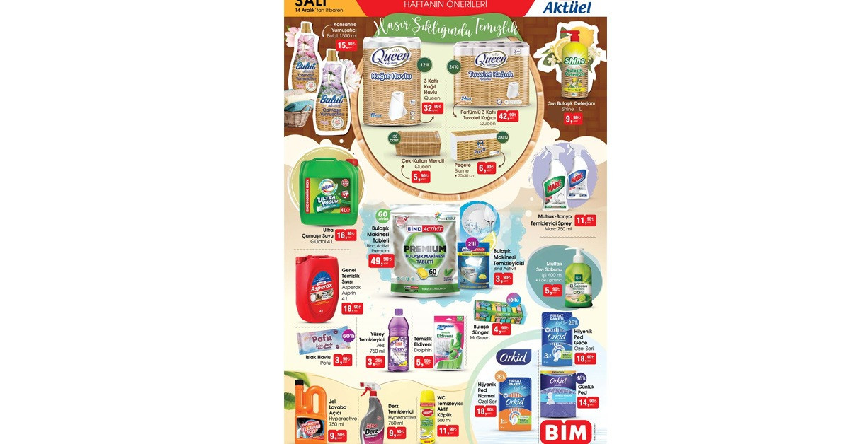 Bu hafta Bim'de market ürünlerinde temizlik malzemeleri öne çıkıyor. Tuvalet kağıtlarından deterjanlara kadar birçok ürün bulunuyor. 24'lü Parfümlü 3 Katlı Tuvalet Kağıdı 42,90 TL fiyatıyla bu hafta Bim'de.