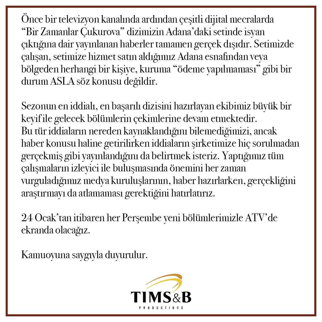 'önce bir televizyon kanalında ardından çeşitli dijital mecralarda 'bir zamanlar çukurova' dizimizin adana'daki setinde isyan çıktığına dair yayınlanan haberler tamamen gerçek dışıdır.