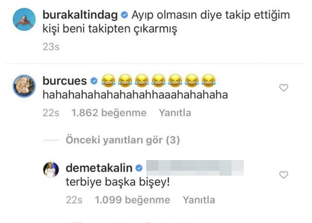 Burcu esmersoy'un “hahahahahahahahaha” yazdığı yorumu gören demet akalın, kayıtsız kalamadı. ünlü şarkıcı, esmersoy'un yorumunun altına “terbiye başka bir şey” mesajını yazdı.