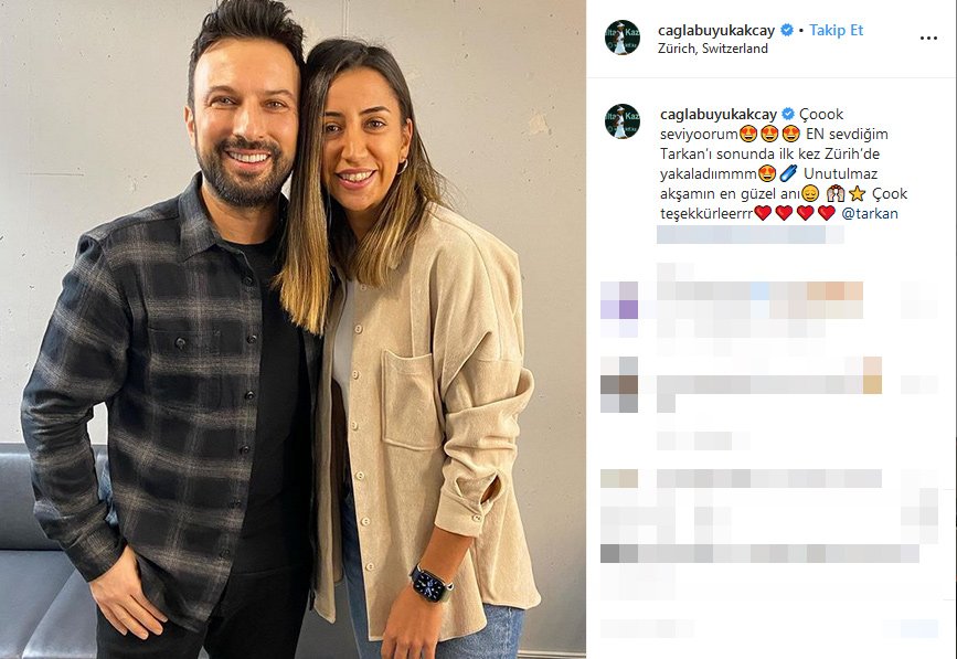 Milli tenisçi çağla büyükakçay, tarkan'la verdiği pozun altına şu notu düştü: “çok seviyorum, en sevdiğim tarkan'ı sonunda ilk kez zürih'te yakaladım. unutulmaz akşamın en güzel anı… çok teşekkürler”