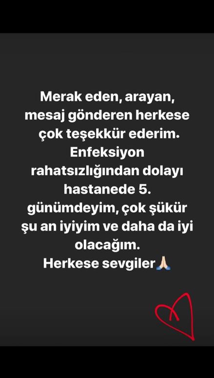 Şıkel, paylaşımında ‘merak eden, arayan, mesaj gönderen herkese çok teşekkür ederim. enfeksiyon rahatsızlığından dolayı hastanede 5. günümdeyim, çok şükür şu an iyiyim’ notunu düştü.