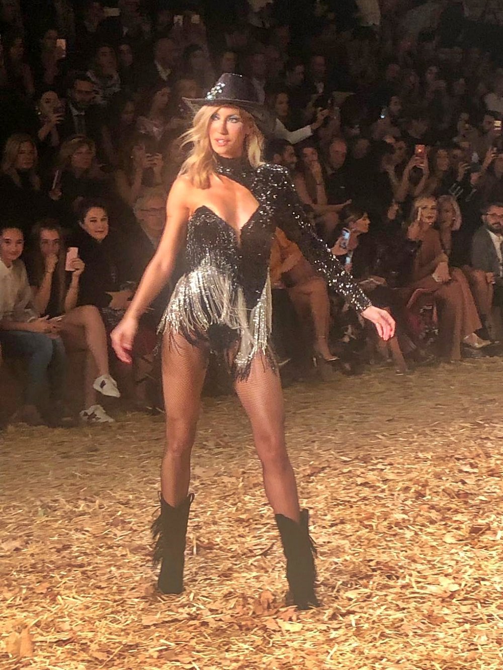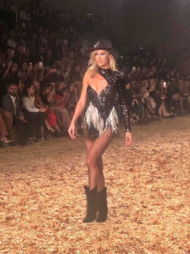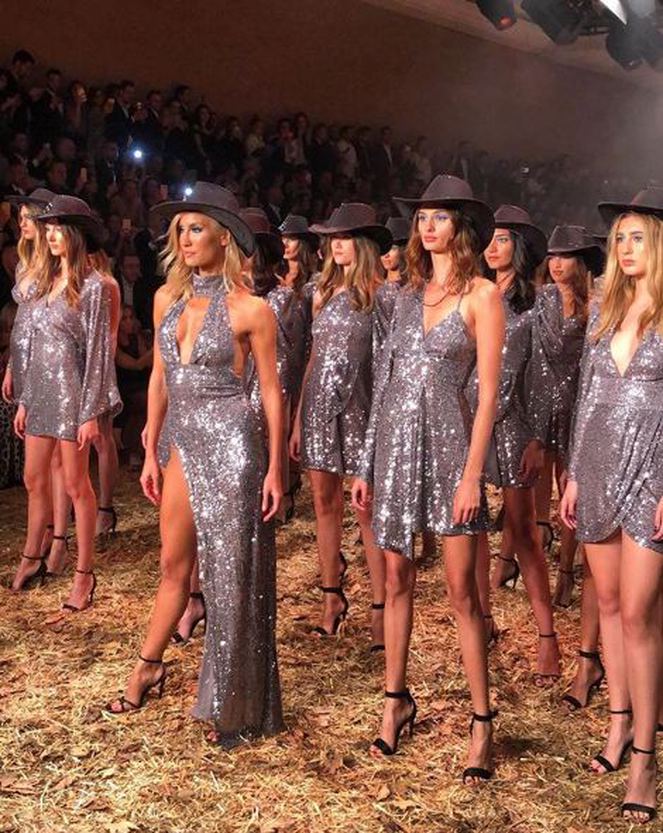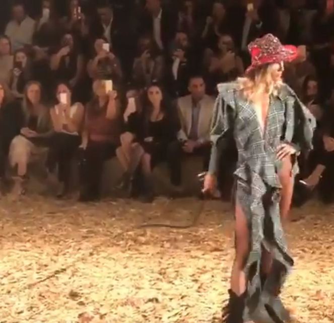Başarılı model, elinde kırbaç ve kovboy şapkasıyla podyuma giriş yaptı.