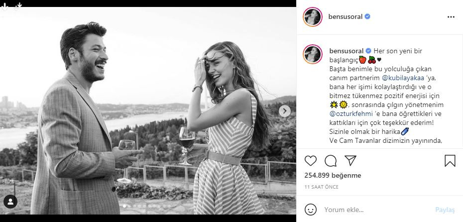 Cam Tavanlar'da Leyla karakterine hayat veren Bensu Soral, paylaşımında 'Her son yeni bir başlangıç. Başta benimle bu yolculuğa çıkan canım partnerim Kubilay Aka'ya, bana her işimi kolaylaştırdığı ve o bitmez tükenmez pozitif enerjisi için sonrasında çılgın yönetmenim Fehmi Öztürk'e bana öğrettikleri ve kattıkları için çok teşekkür ederim! Sizinle olmak bir harika. Ve Cam Tavanlar dizimizin yayınında, yapımında, kamera önünde-kamera arkasında emeği geçen tüm arkadaşlarımın ellerine sağlık. Sizinle çalışmak çok ama çok eğlenceliydi! Hepinizi çok seviyorum. Her şey kötüye gidiyormuş gibi olduğunda, durup bir elma ye. Önce bir dur yani, Biz hep öyle yapıyoruz' ifadelerini kullandı.