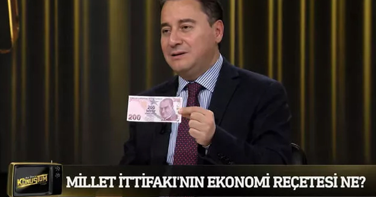 Kaldı ki biz altı partinin ortak mutabakatıyla hükümetin organizasyon şemasını belirledik. Burada 20 tane bakanlık söz konusu. Biz Hazine ve Maliye bakanlığını ayırıyoruz" Sabit gelirlinin tamamının fakirleştiğini ve orta direk diye bir kavramın kalmadığını ifade eden Babacan, canlı yayından cüzdanından 200 TL çıkararak gösterdi.