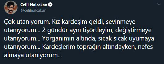 Twitter hesabında paylaşım yapan celil nalçakan, şehit haberini aldıktan sonra yaşadıklarını şu sözlerle anlattı: “çok utanıyorum.