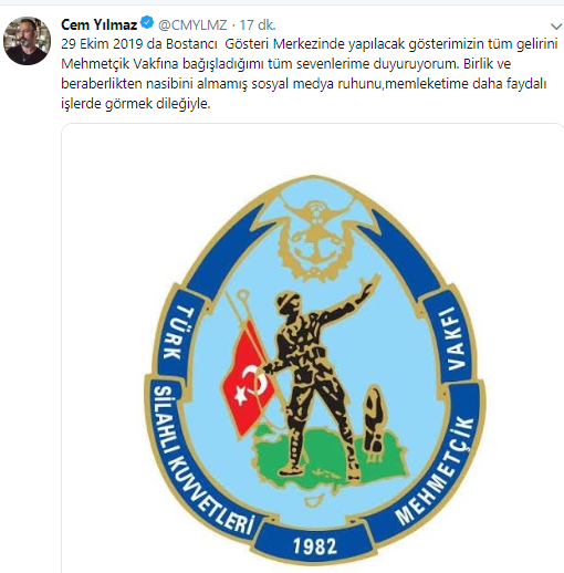 Demet akalın'ın ardından cem yılmaz da 29 ekim 2019 tarihinde bostancı gösteri merkezi'nde yapılacak olan gösterisinin gelirini mehmetçik vakfı'na bağışladığını sosyal medya hesabından duyurdu.