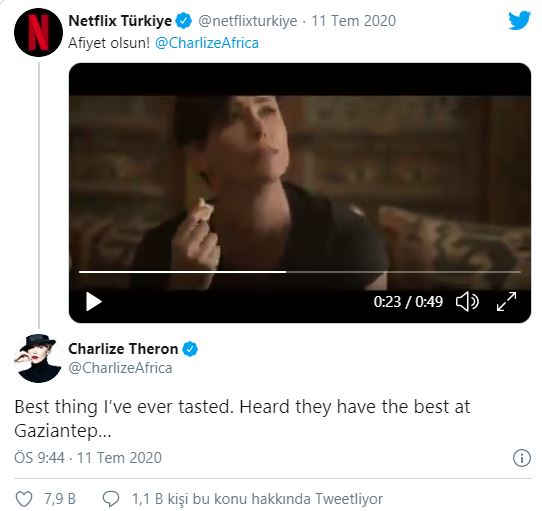 Charlize theron, netflix türkiye hesabının ‘the old guard’ filminde baklava yerken görüldüğü anları ‘afiyet olsun’ sözleriyle yayınlaması üzerine verdiği karşılıkla dikkat çekti.