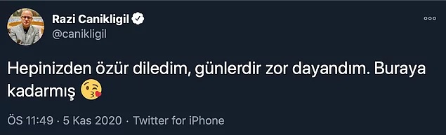 Canikligil daha sonra tweet atarak, "Hepinizden özür diledim, günlerdir zor dayandım. Buraya kadarmış" ifadelerini kullandı.