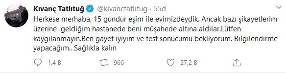 Önceki akşam kontrol amaçlı hastaneye giden ve coronavirüs şüphesiyle tedavi altına alınan kıvanç tatlıtuğ, sosyal medya hesabında açıklama yaptı.