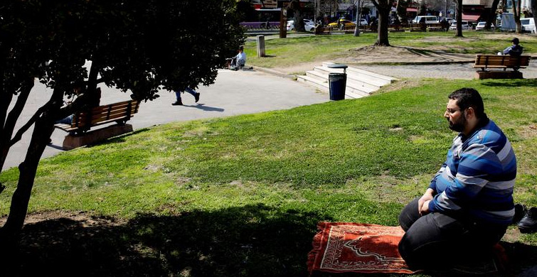 İstanbul’da camilerde toplu ibadetler askıya alındığından dolayı dışarda namaz kılan bir adam.