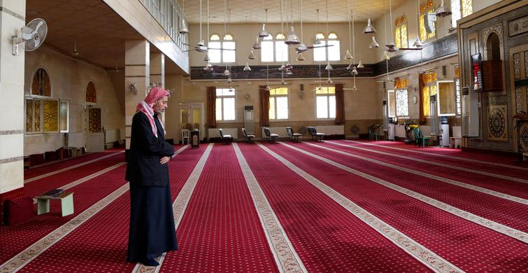 Suriye'nin hama kentinde cuma namazı askıya alındığı için boş camide tek başına namaz kılan bir adam.