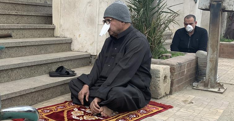 Coronavirüse karşı ekstra bir önlem olarak burnunun üzerine beyaz bir mendil örten 65 yaşındaki profesör reda abd el wahed, mısır'ın kahire kentindeki abdel rahman camii dışında cuma namazı kılıyor.