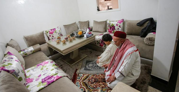57 yaşındaki ahmed ve 10 yaşındaki oğlu fas, kazablanka'daki evlerinde cuma namazı kılıyor.
