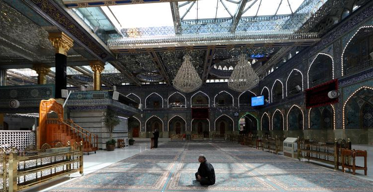 Irak'ın kerbala kentinde cuma namazları askıya alındığı için boş olan imam abbas türbesinin içinde oturan bir adam.