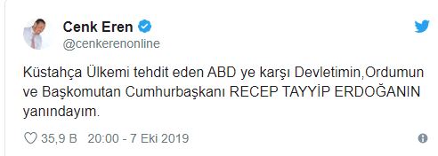 Ünlü sanatçı cenk eren twitter üzerinden "küstahça ülkemi tehdit eden abd ye karşı devletimin, ordumun ve başkomutan cumhurbaşkanı recep tayyip erdoğanın yanındayım." paylaşımında bulundu.