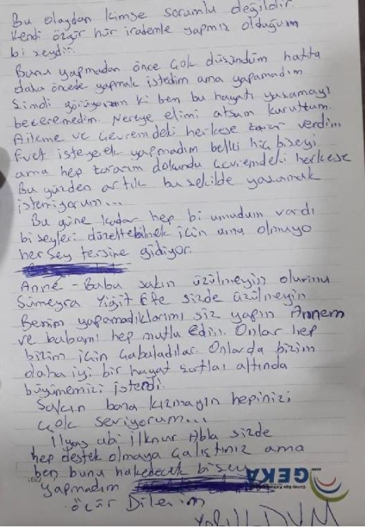 23 yaşındaki genç ATT Ömer Ç.'nin intihar etmeden önce bıraktığı mektubunda ise "Anne baba sakın üzülmeyin olur mu? Benim yapamadıklarımı siz yapın. Annemi ve babamı hep mutlu edin. Onlar hep bizim için çabaladılar. Onlar da bizim daha iyi bir hayat şartları altında büyümemiz isterdi" dedi. İntihar mektubunun altına özür dileyerek yoruldum yazan Ömer Ç. "Yaşamayı beceremedim. Nereye elimi atsam kuruttum. İntiharı kendi hür irademle yaptım. Sakın bana kızmayın, hepinizi çok seviyorum." yazdığı kaydedildi.
