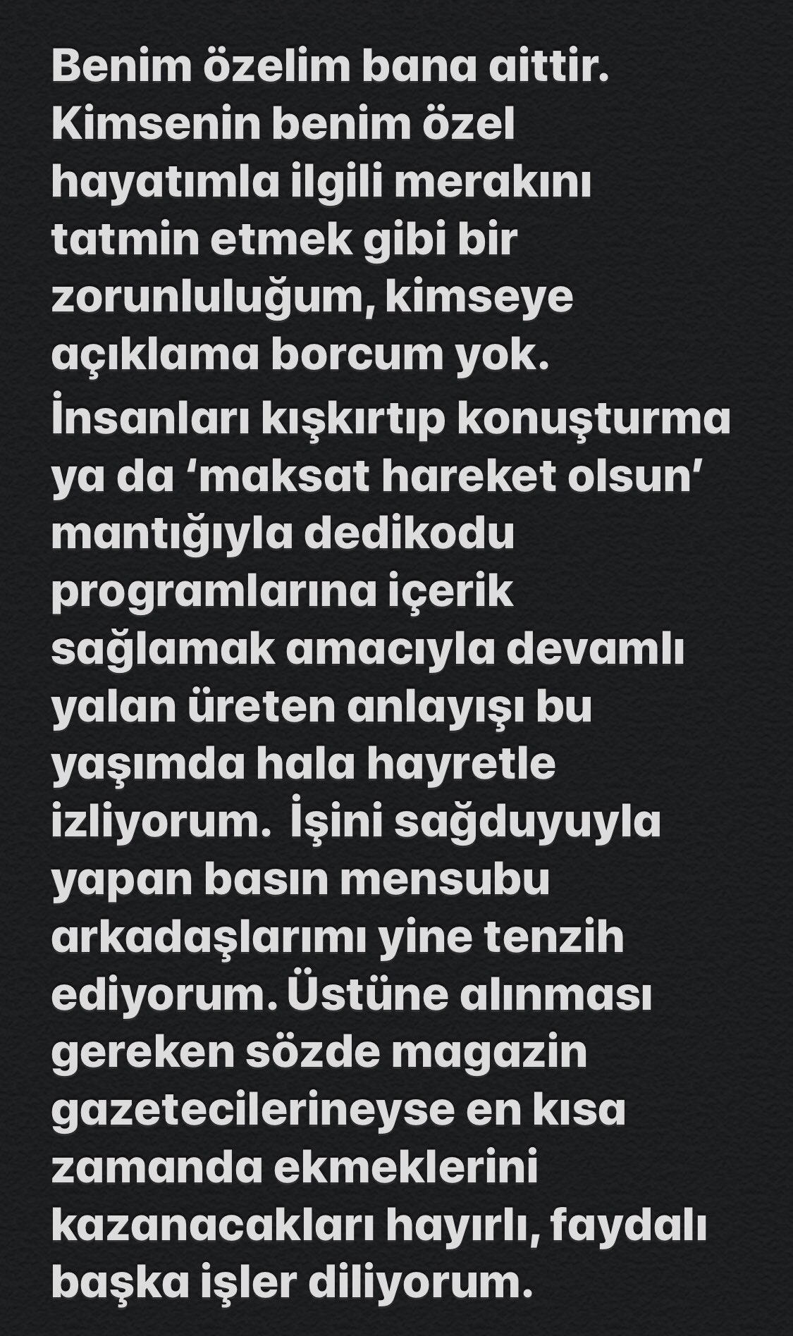 İşini sağduyuyla yapan basın mensubu arkadaşlarımı yine tenzih ediyorum. üstüne alınması gereken sözde magazin gazetecileri neyse en kısa zamanda ekmeklerini kazanacakları hayırlı, faydalı başka işler diliyorum...' ifadelerini kullandı.