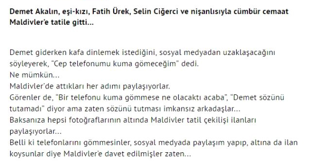 Demet akalın ve selin ciğerci paylaşımlarında maldivler çekilişi yapmalarına cengiz semercioğlu tepki gösterdi. semercioğlu, köşe yazısında 'hepsi fotoğraflarının altında maldivler tatil çekiliş ilanları paylaşıyor. belli ki telefonlarını gömmesinler, sosyal medyada paylaşım yapıp, altına da ilan koysunlar diye maldivler'e davet edilmişler zaten' ifadelerini kullandı.