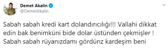 Yaptığı alışverişler ile bilinen demet akalın'ın başı bu sefer fena yandı. kredi kartı dolandırıcılarından nasibini alan demet akalın twitter'dan tepki gösterdi.
