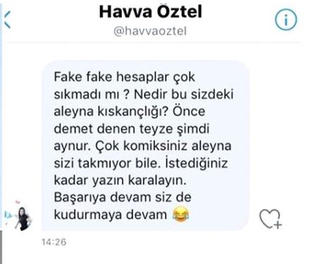 Öztel, yazdığı mesajda 'nedir sizdeki bu aleyna kıskançlığı! önce demet denen teyze şimdi aynur' ifadelerini kullandı.