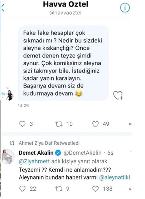 Demet akalın, havva öztel'in kendisine yaptığı çıkışa anlam veremediğini ifade eden bir yanıt vererek 'teyze mi? kendi ne anlamadım. aleyna'nın bundan haberi var mı?' dedi.