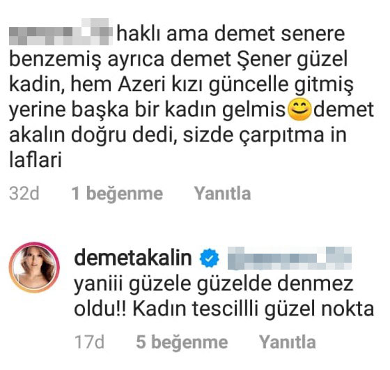 ‘Haklı ama Demet Şener’e benzemiş ayrıca Demet Şener güzel kadın… Hem Azeri kızı Günel gitmiş yerine başka bir kadın gelmiş. Demet Akalın doğru dedi, sizde çarpıtmayın lafları’