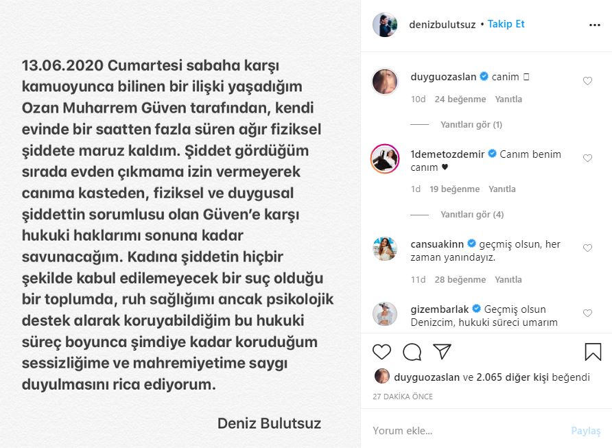 Instagram hesabında açıklama yapan deniz bulutsuz, şu ifadeleri kullandı: “13.06.2020 cumartesi sabaha karşı kamuoyunca bilinen bir ilişki yaşadığım ozan muharrem güven tarafından, kendi evinde bir saatten fazla süren ağır fiziksel şiddete maruz kaldım.