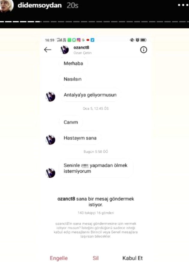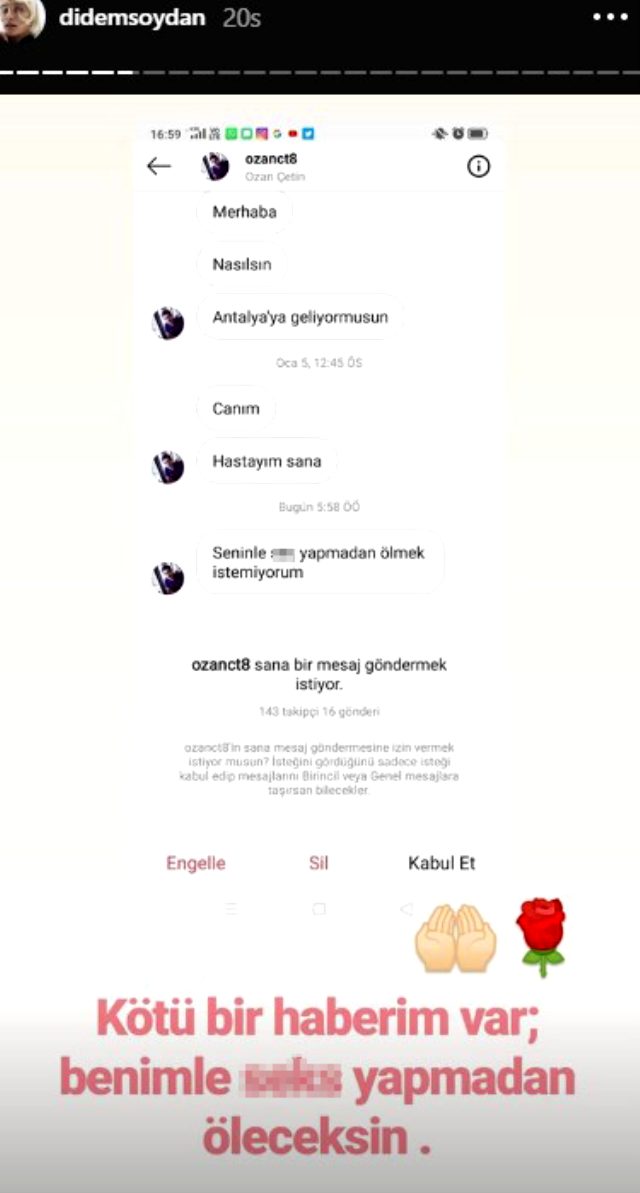 Yaptığı her hareket söylediği her söz olay yaratan didem soydan bir takipçisinin kendisine yazdığı 'seninle birliktelik yaşamadan ölmek istemiyorum' mesajını ınstagram'dan ifşa etti.