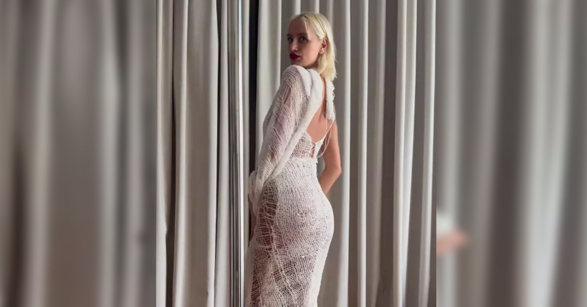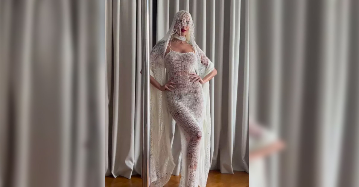 Ünlü manken Didem Soydan iplikten yapılmış elbisesiyle şekilden şekle girerek pozlar verdi.